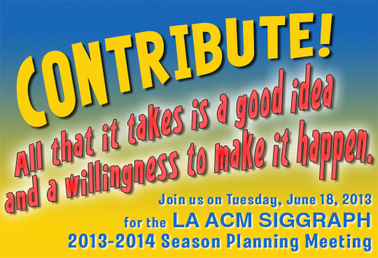 RSVP's to chair@la-siggraph.org are required. There is no cost for this meeting. If you attend, you are expected to participate by providing event ideas, (nicely) critiquing presented ideas, and helping assemble the schedule.