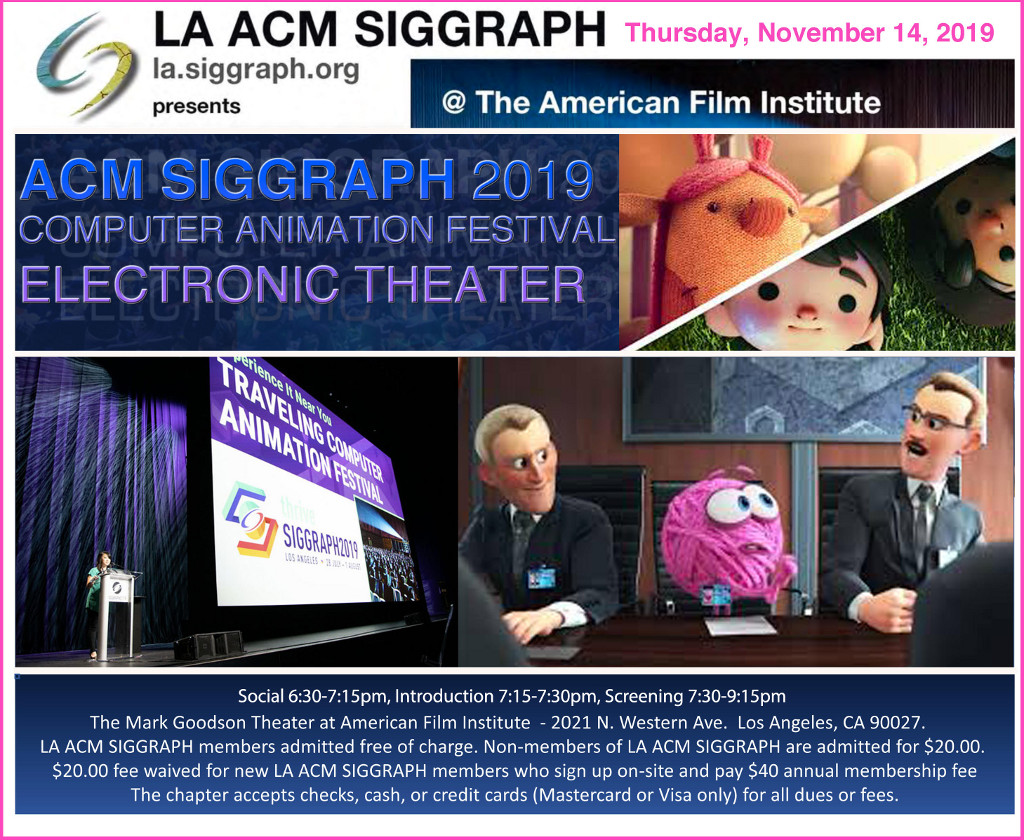 All LA ACM SIGGRAPH will be admitted free of charge. Non-members of LA ACM SIGGRAPH are admitted for $20.00. New LA ACM SIGGRAPH members who sign up on-site, and pay the $40 annual membership fee, do not have to pay the $20 admission fee. The chapter accepts  checks, cash, or credit cards (Mastercard or Visa only) for all dues or fees.