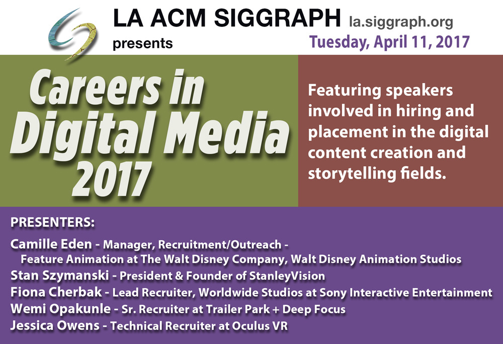 What is the outlook for careers across the digital media spectrum – from artists to technical directors to producers in VR, games, motion design, film and other media "yet to be invented"? Hear and question a panel of hiring managers and veteran recruiters share the inside scoop on where the jobs are … and where they aren’t.