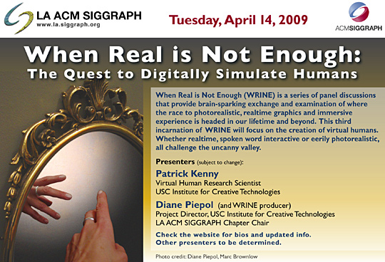 When Real is Not Enough (WRINE) is a series of panel discussions that provide brain-sparking exchange and examination of where the race to photorealistic, realtime graphics and immersive experience is headed in our lifetime and beyond. This third incarnation of WRINE will focus on the creation of virtual humans. Whether realtime, spoken word interactive or eerily photorealistic, all challenge the uncanny valley.