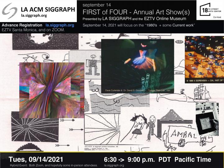 LA ACM SIGGRAPH and the EZTV Online Museum presents the FIRST of FOUR - Annual Art Show(s). Co-Hosted by the 18th Street Art Center. The FIRST OF FOUR will focus on the 1980's, with some current work. Presenters include - David Em, Dave Curlender, Coco Conn, Victor Acevedo, Michael Wright, Kate Crash, and Michael Masucci. The other of FOUR Art Shows will focus on later decades. You must register for free with Zoom registration to attend this Webinar.