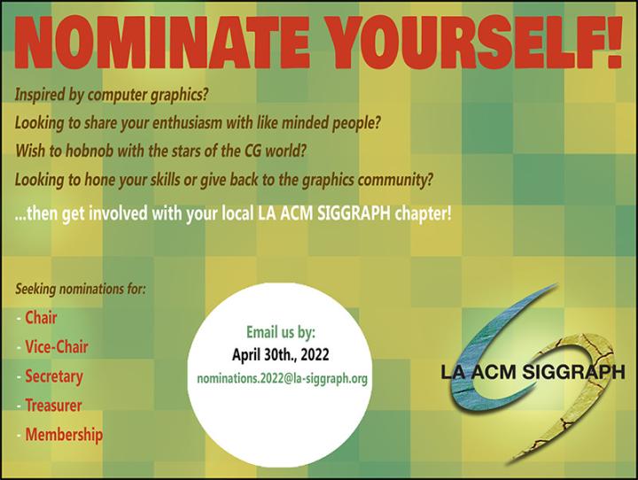 The Los Angeles Chapter of ACM SIGGRAPH is seeking nominations for Chair, Vice-Chair, Secretary, Treasurer, and Membership. We are looking for experienced people like you to lead the world renowned chapter for its next season.